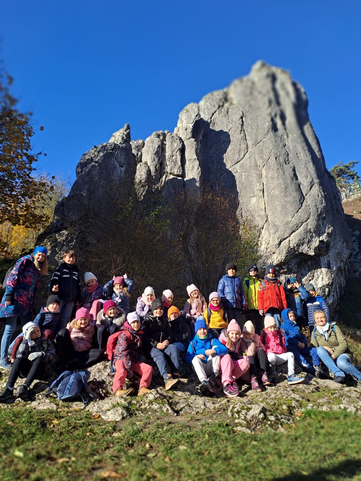 Na miejscu uczniowie z zaciekawieniem słuchali opowieści Pani przewodnik. Próbowali też jadalnych roślin, zapamiętywali te , których należy unikać oraz rozpoznawali ślady zwierząt. Pani pokazała, jak bezpiecznie korzystać z noża i jak dbać o przyrodę.  Mieli też okazję całą klasą stanąć pod wielką skałą w blasku słońca, a nad głową wspinali się alpiniści ! 2a niczym harcerze, zdobyli odznakę survivalową- ogniomistrza, ponieważ nauczyli się posługiwać krzesiwem.