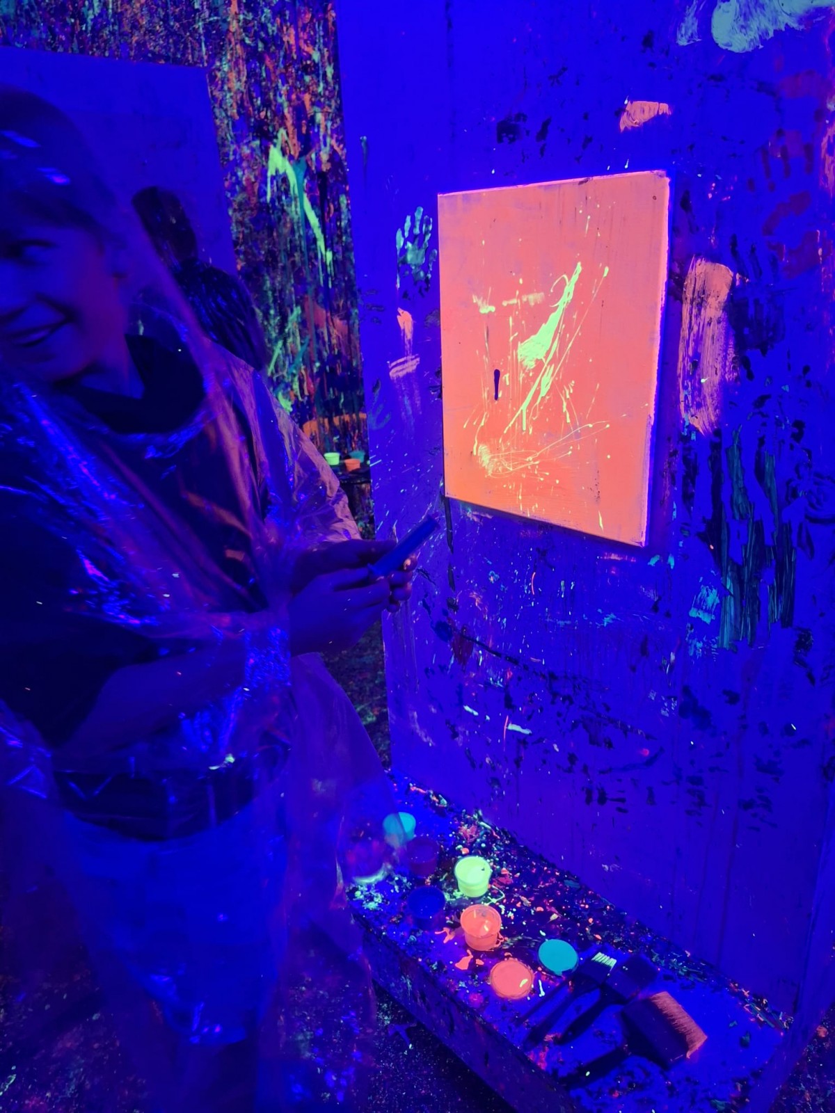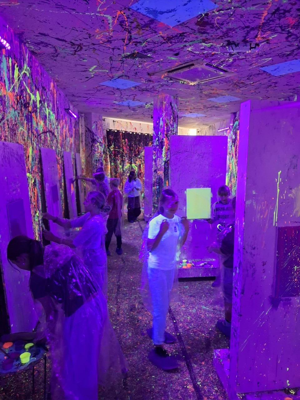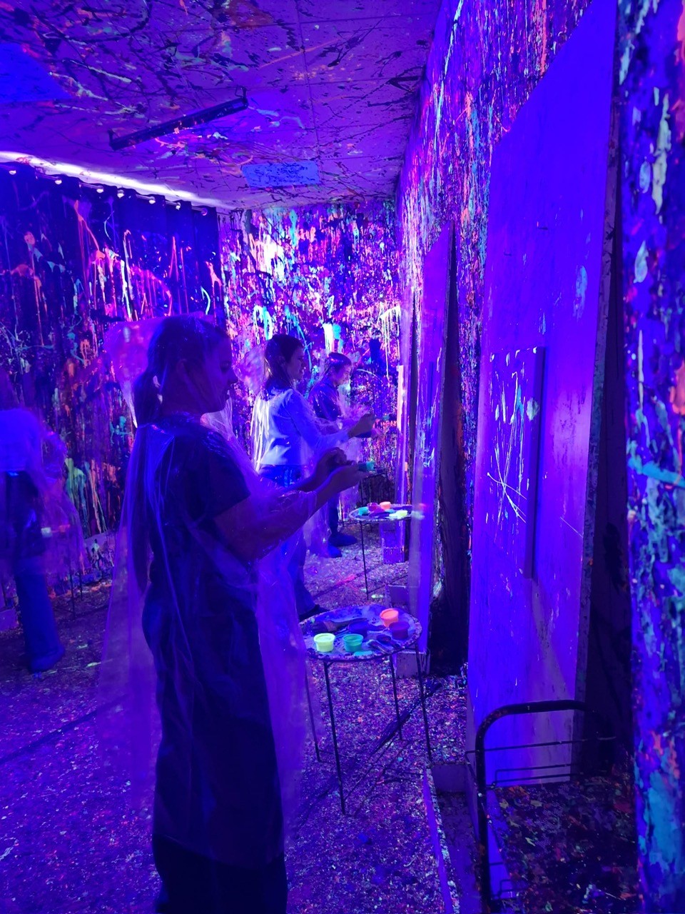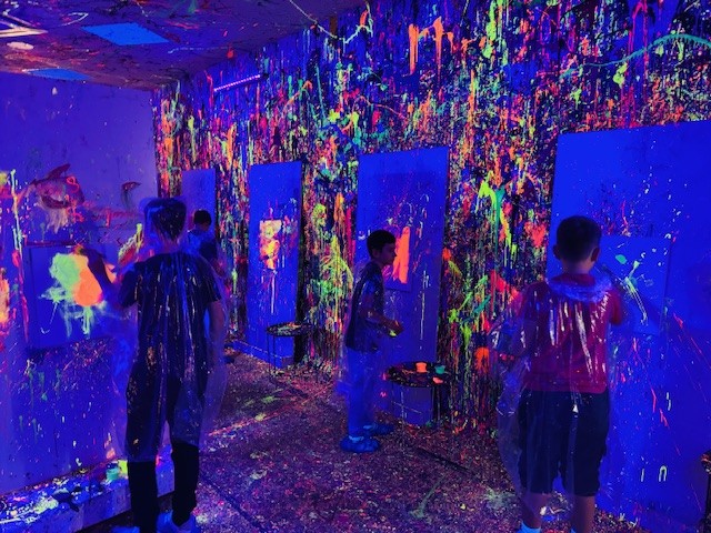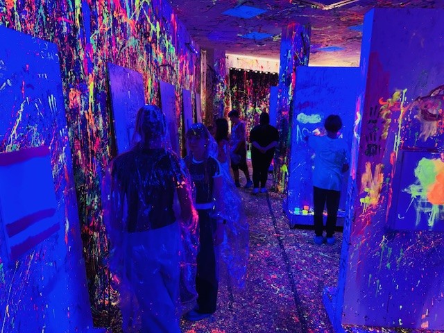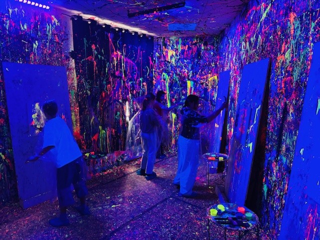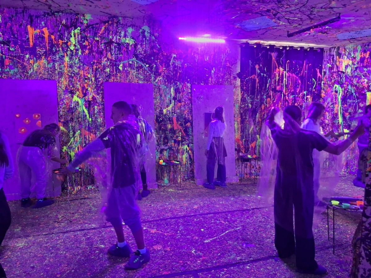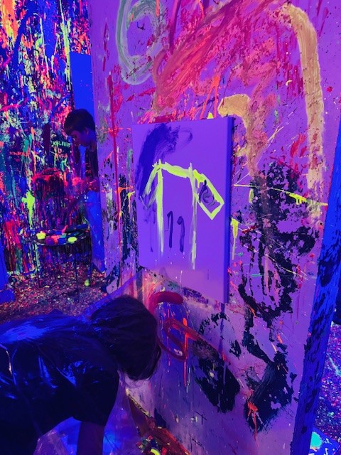 Malowanie odbywało się w dużym pomieszczeniu oświetlonym światłem uv. Podczas zajęć świetnie się bawiliśmy, było chlapanie, wiele emocji i śmiechu. Po około dwóch godzinach wyszliśmy z gotowymi pracami spakowanymi w wielkie kartony oraz ogromną satysfakcją z dobrze spędzonego czasu.
