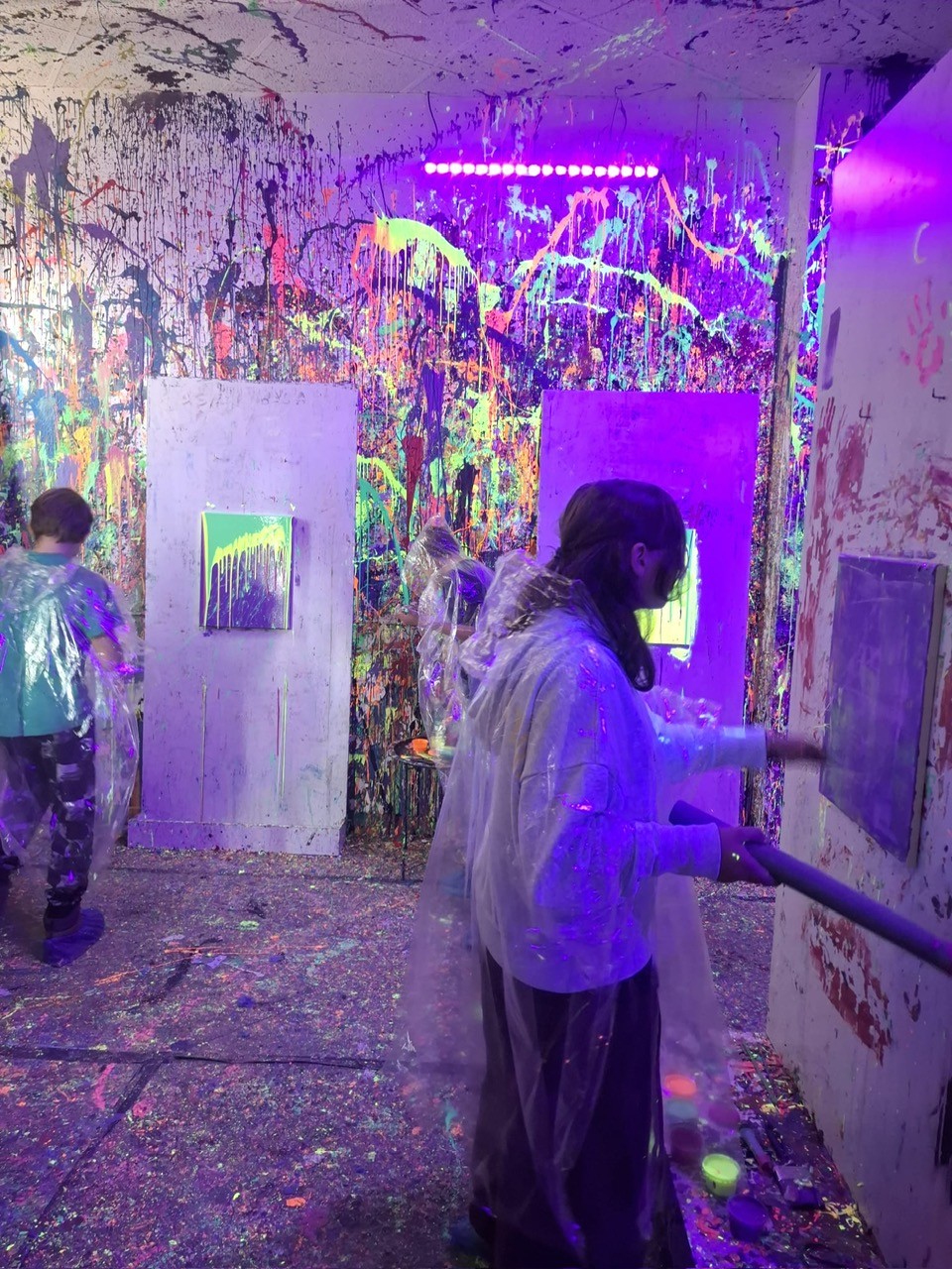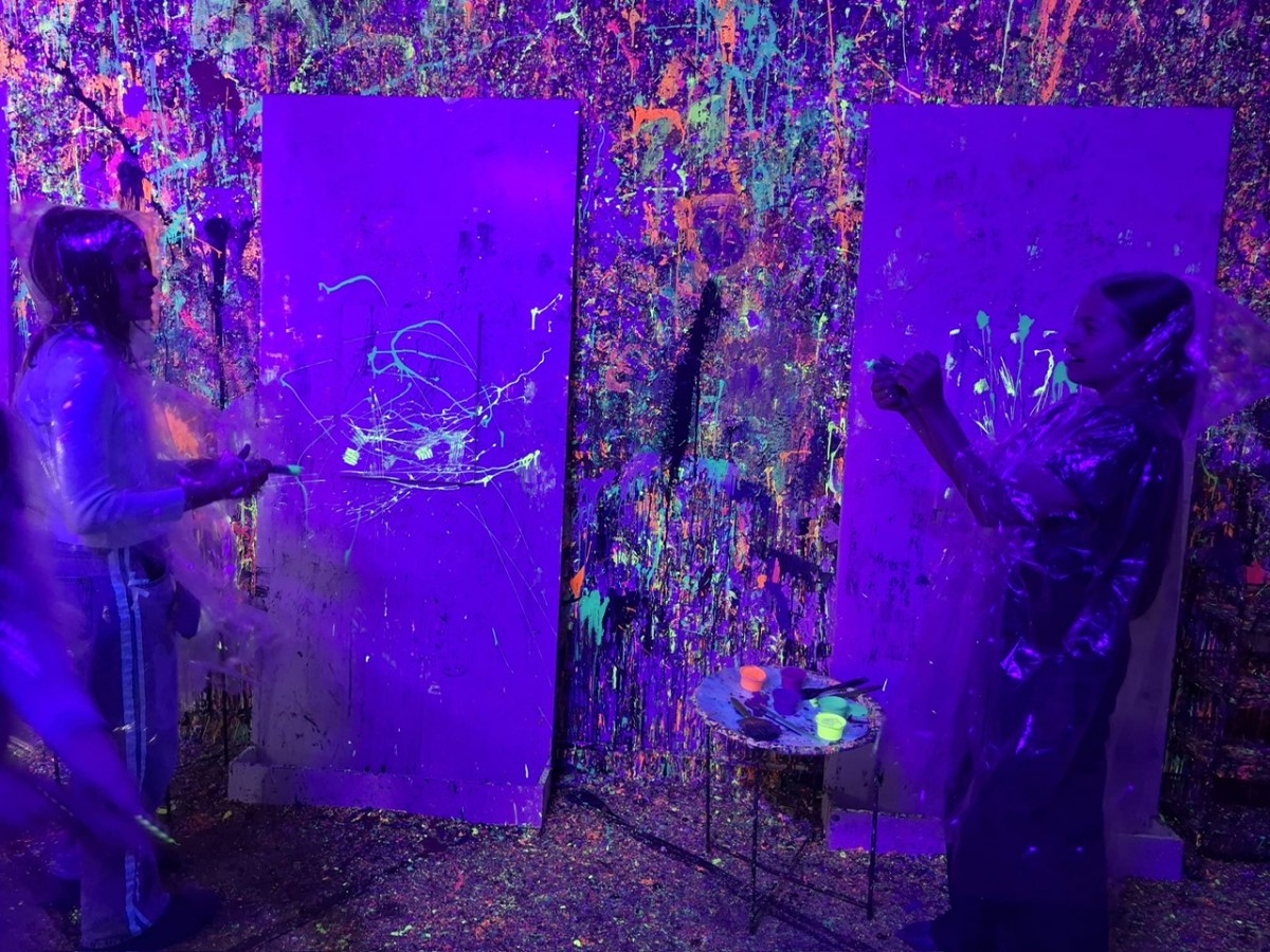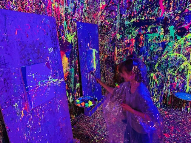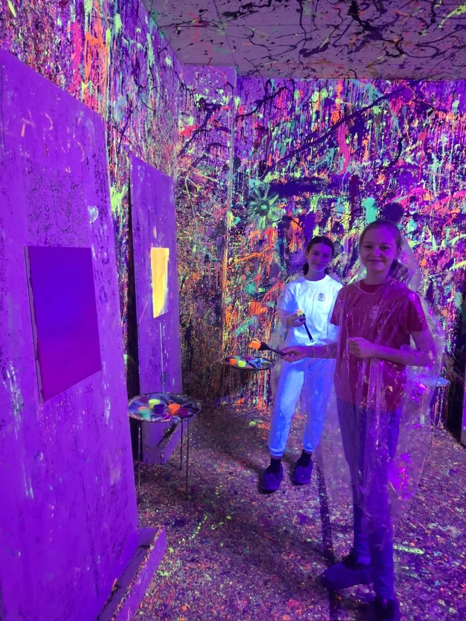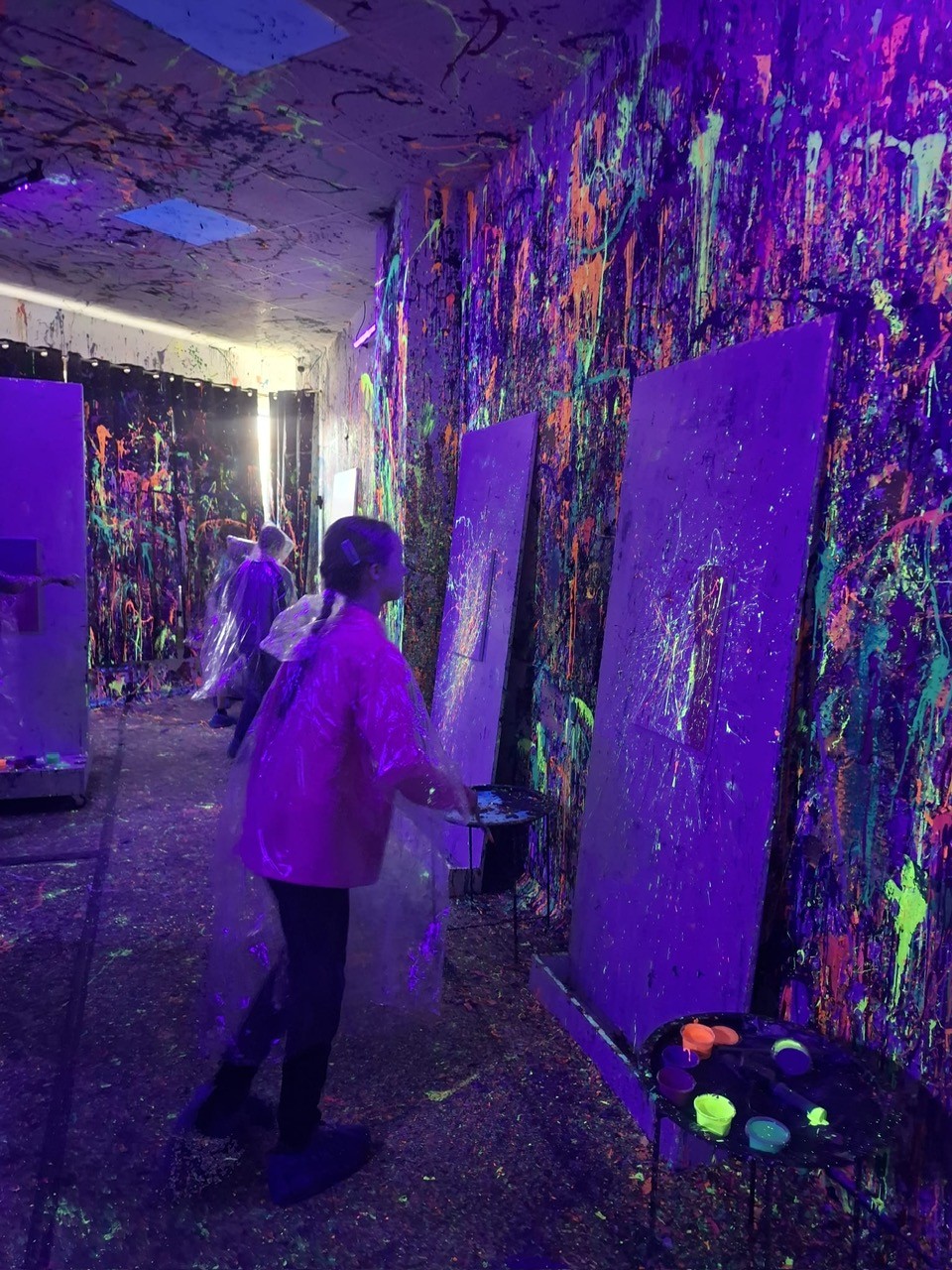 Malowanie odbywało się w dużym pomieszczeniu oświetlonym światłem uv. Podczas zajęć świetnie się bawiliśmy, było chlapanie, wiele emocji i śmiechu. Po około dwóch godzinach wyszliśmy z gotowymi pracami spakowanymi w wielkie kartony oraz ogromną satysfakcją z dobrze spędzonego czasu.