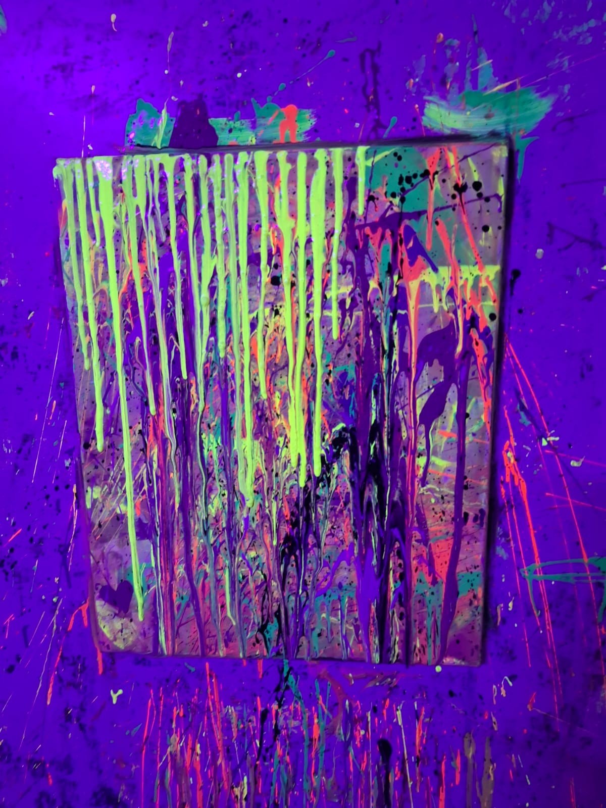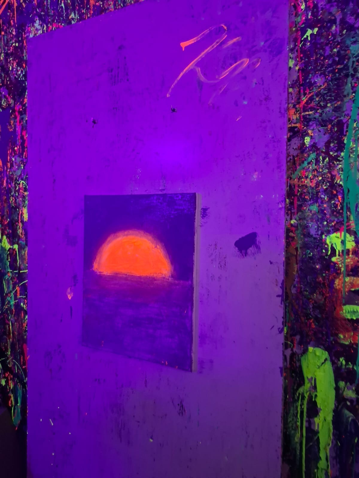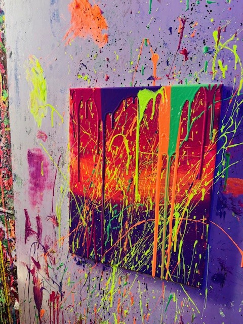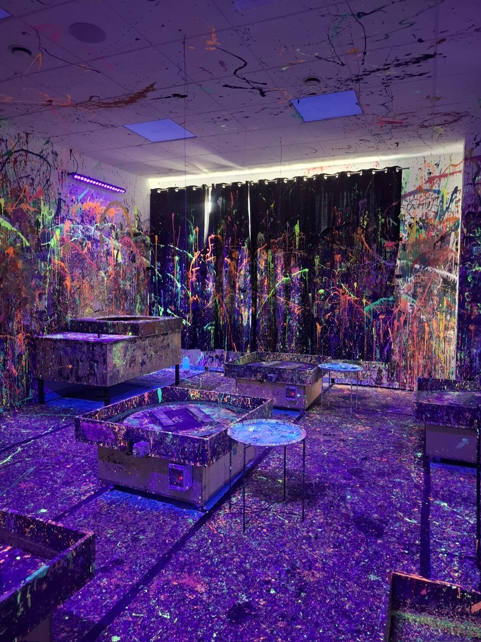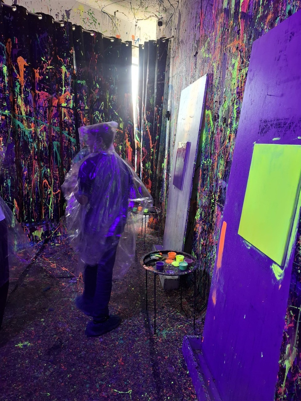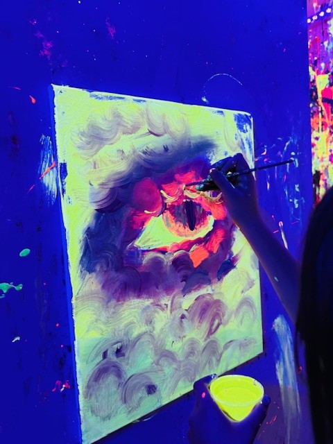 Malowanie odbywało się w dużym pomieszczeniu oświetlonym światłem uv. Podczas zajęć świetnie się bawiliśmy, było chlapanie, wiele emocji i śmiechu. Po około dwóch godzinach wyszliśmy z gotowymi pracami spakowanymi w wielkie kartony oraz ogromną satysfakcją z dobrze spędzonego czasu.