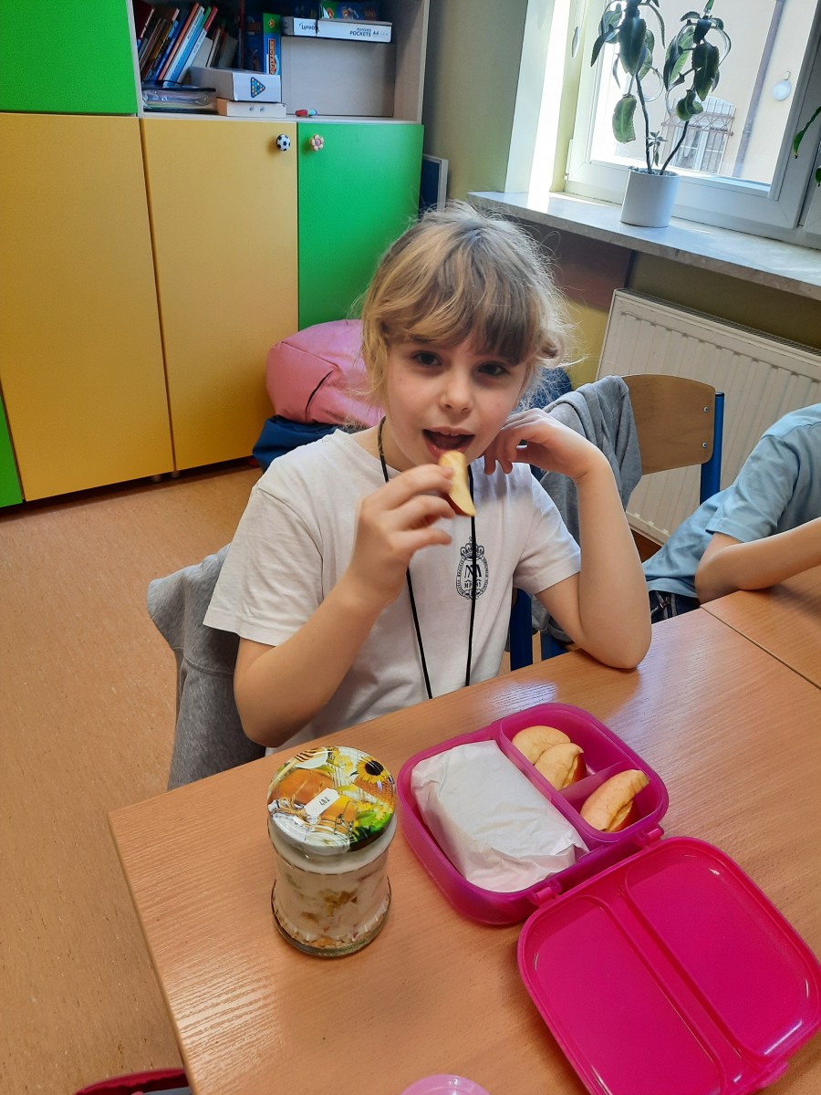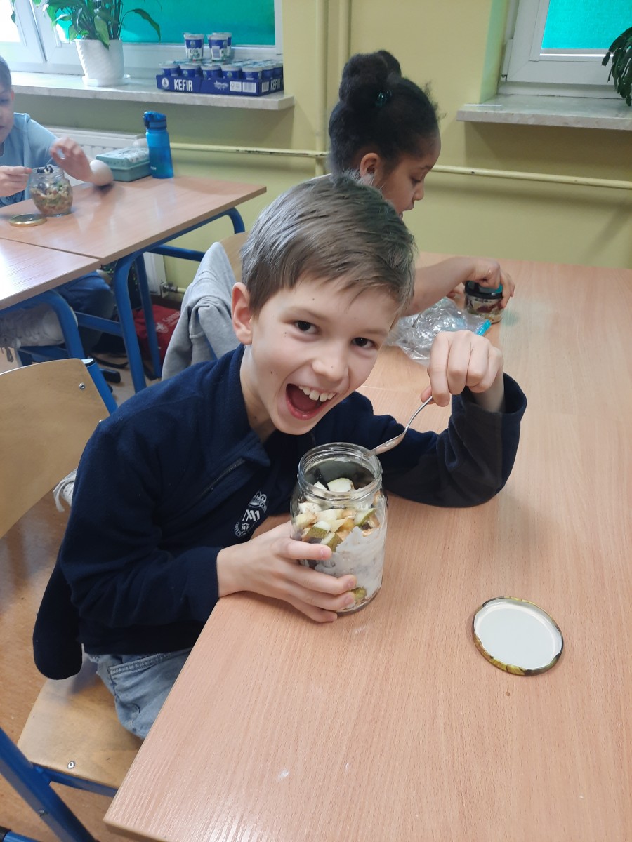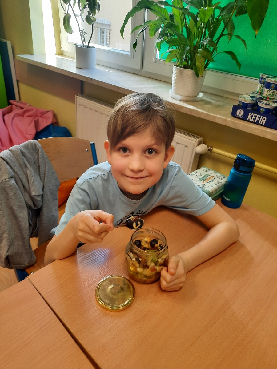 Uczniowie z wielkim apetytem zjedli swoje sałatki, ciesząc się owocami własnej pracy w radosnej, klasowej atmosferze.