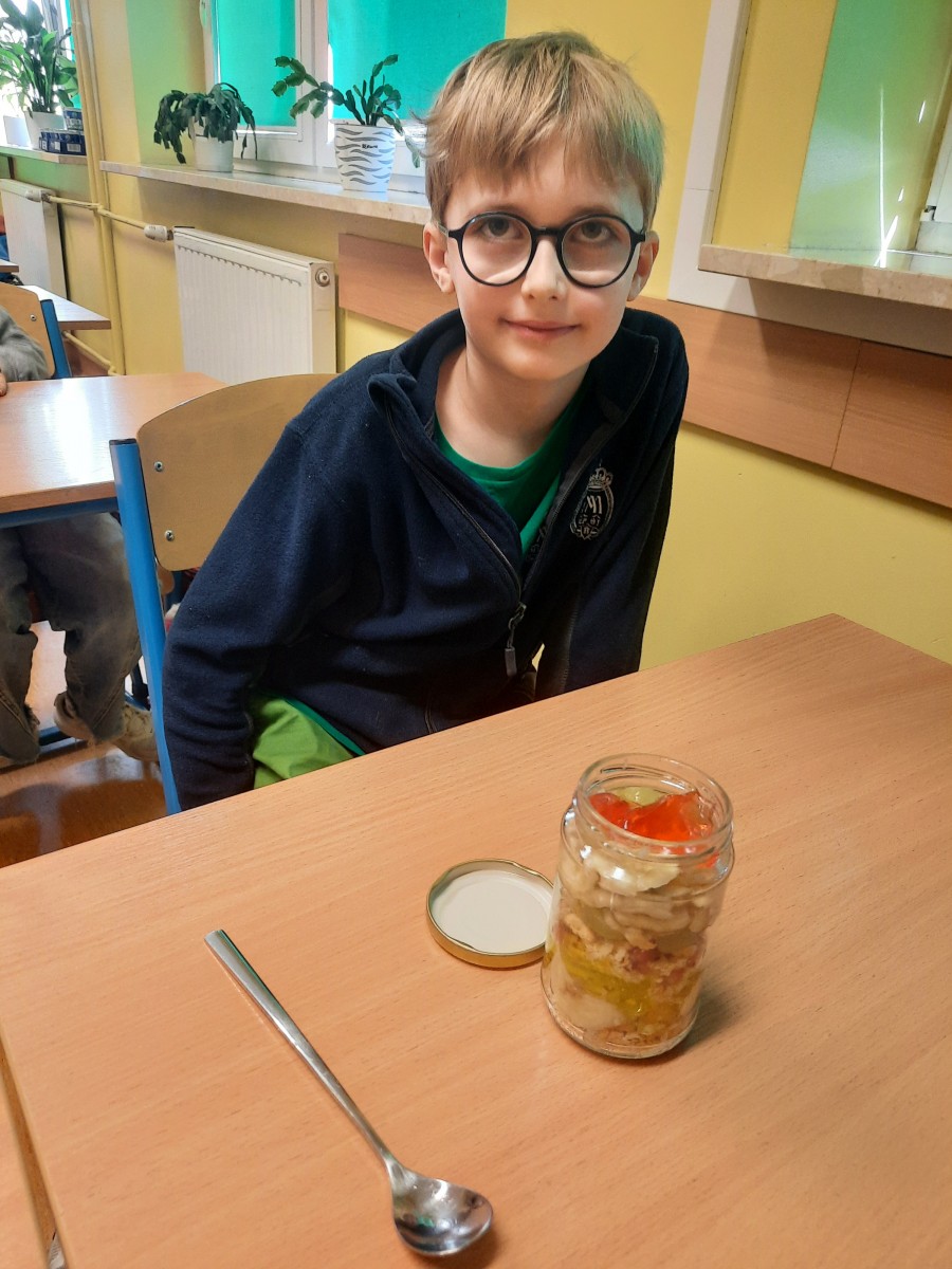 Praca rozpoczęła się od przypomnienia zasad higieny – uczniowie zadbali o czystość rąk oraz swoich stanowisk pracy. Następnie przystąpili do tworzenia wielowarstwowych sałatek według własnego pomysłu.