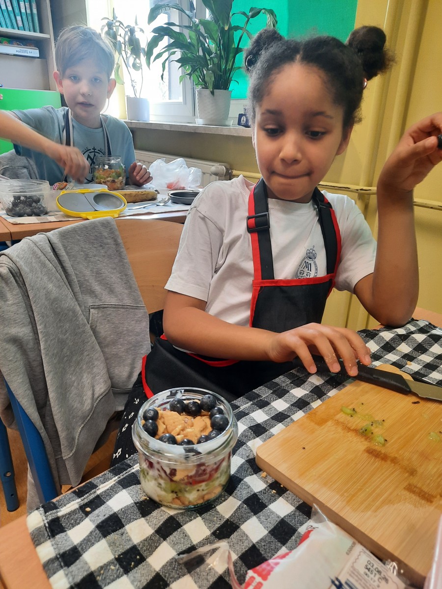 Podczas pracy uczniowie doskonalili umiejętność bezpiecznego posługiwania się akcesoriami kuchennymi oraz dbali o estetykę podania. Warsztaty zakończyły się wspólną degustacją.