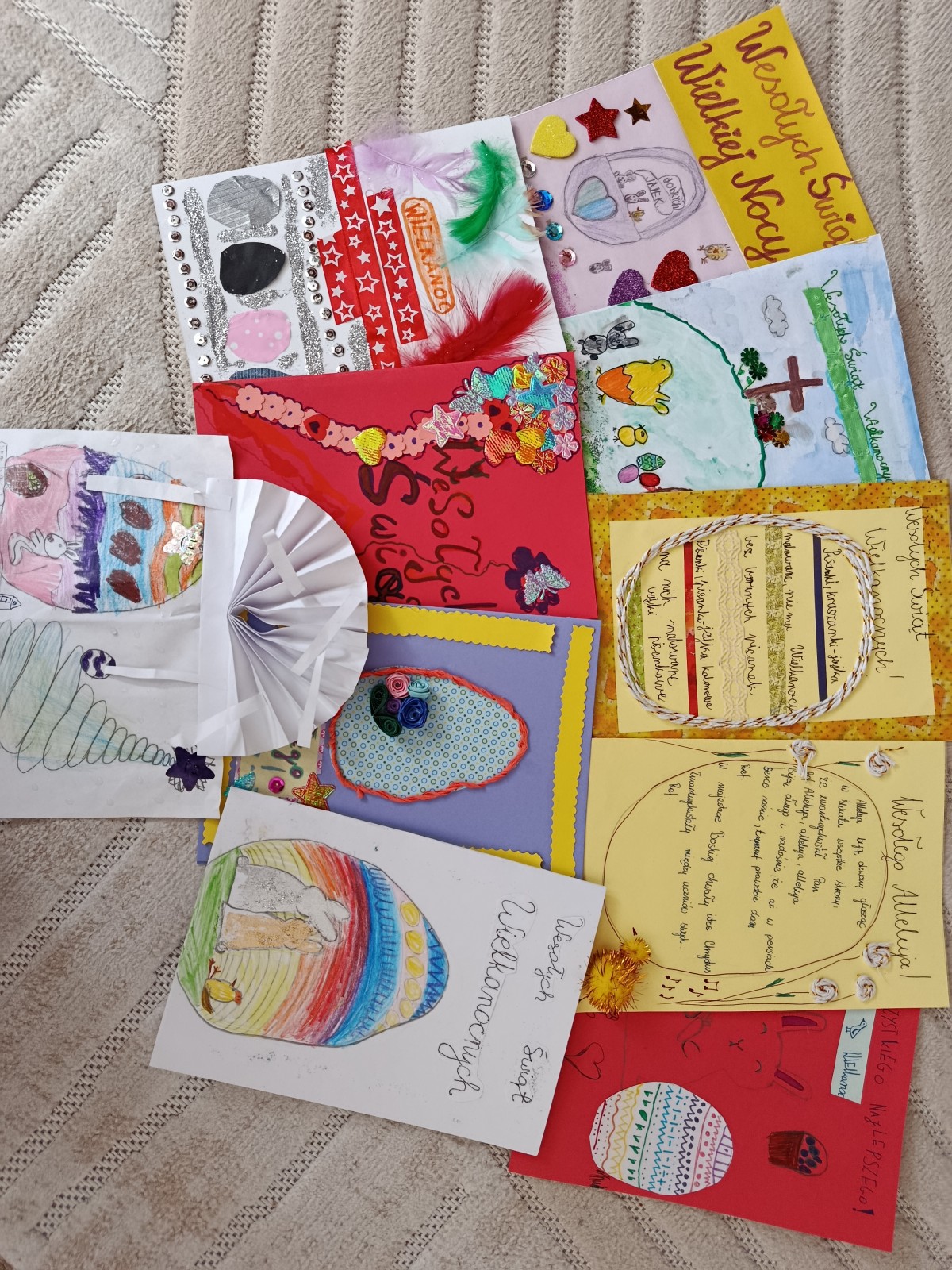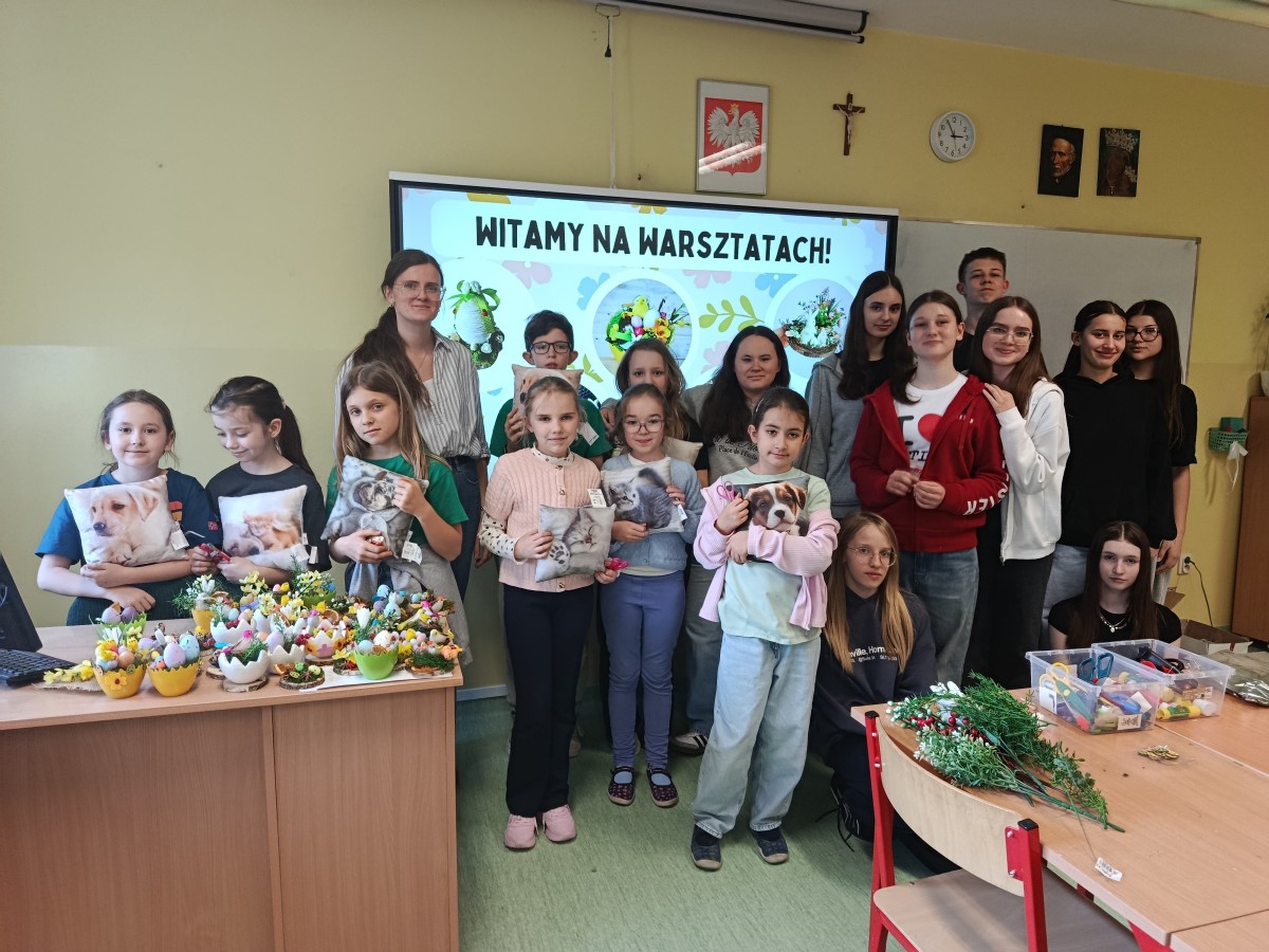 Projekt miał swoje dwie odsłony. Pierwszą był szkolny konkurs na najpiękniejszą kartkę wielkanocną, w której udział wzięło aż 41 uczniów. Wszyscy uczestnicy otrzymali nagrody, a pokonkursowe kartki zostały przekazane na cele charytatywne: kiermasz wielkanocny, organizowany w naszej szkole, oraz do pacjentów szpitali na terenie Krakowa. Drugim punktem programu była organizacja warsztatów ozdób świątecznych dla dzieci z klas 3-4, przebywających na świetlicy. Warsztaty odbyły się 13 marca. Uczniowie z młodszych klas pod okiem starszych, bardziej doświadczonych wolontariuszy przygotowywali stroiki i ozdoby wielkanocne, przy okazji poznając zasady działania Szkolnego Koła Wolontariatu. Współpraca starszych z młodszymi okazała się być bardzo owocna, ponieważ w ciągu godziny wykonaliśmy ok. 45 stroików, które również zostały przekazane na szkolny kiermasz charytatywny. Uczestnicy warsztatów otrzymali w podziękowaniu drobne upominki.